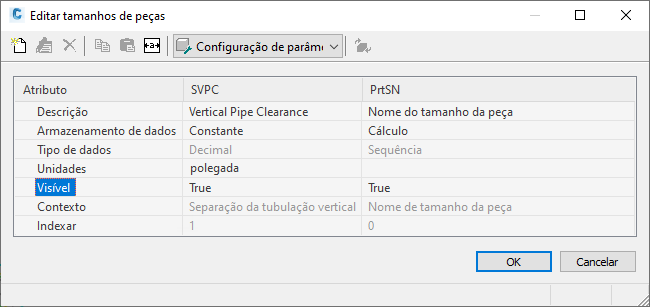 A caixa de diálogo Editar tamanhos de peça é exibida, mostrando todos os parâmetros de tamanho no momento disponíveis para a peça selecionada. Para o exemplo de Estrutura cilíndrica simples, alguns parâmetros de tamanho de peça são Nome do tamanho da peça (PrtSN) e Folga da tubulação de estrutura vertical (SVPC).