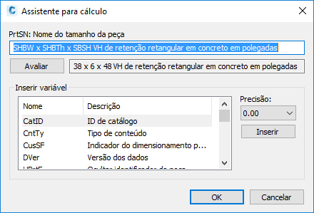 As sequências de cálculo associadas com os valores do parâmetro são exibidas. Por exemplo, a fórmula de cálculo para um Nome de tamanho de peça (PrtSN) para uma estrutura deveria ser “SHBW x SHBTh x SBSH polegadas da Parede de Retenção de Concreto”. Ou para uma tubulação, poderia ser FormatNumber($PID,0) + “ polegadas de Tubulação de Concreto”.
