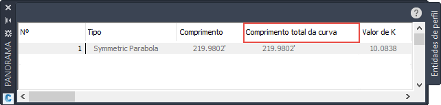 O valor de Comprimento total da curva mostra o comprimento total de curva vertical, enquanto a propriedade Comprimento mostra o comprimento da parte resolvida da geometria da curva, como quando as tangentes são anexadas ao longo das curvas.