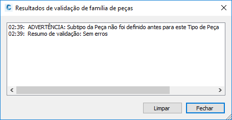 Após a conclusão bem-sucedida destes procedimentos, a peça será validada e a barra de status será atualizada com uma mensagem indicando se a validação da peça foi bem-sucedida.