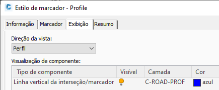 Os estilos de marcador são usados para controlar a aparência de objetos de interseção em gráficos de perfil longitudinal. A aparência do estilo de marcador é controlada na guia Exibição da caixa de diálogo Estilo de marcador. Na lista Direção da exibição, selecione Perfil e edite o modo como o estilo de marcador é configurado para o gráfico do perfil longitudinal. Um único componente controla a exibição do marcador (usado para exibir perfis de interseção, linhas de recurso, imagens do levantamento topográfico e polilinhas 3D) e da linha vertical da interseção (usada para exibir alinhamentos de interseção).