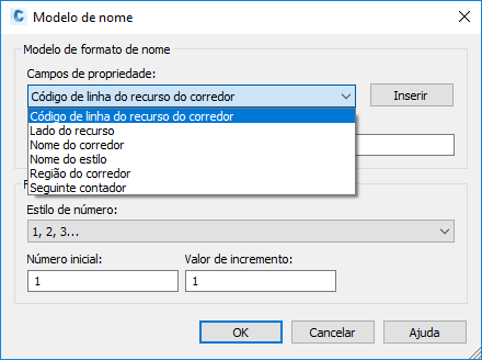 Além disso, para as propriedades Nome do estilo e Próximo contador, é possível especificar diversas propriedades para os nomes de linha do recurso que ajudam a identificá-las em relação ao corredor principal, incluindo o Código da linha do recurso do corredor, Nome do corredor, Região do corredor Lado do recurso.