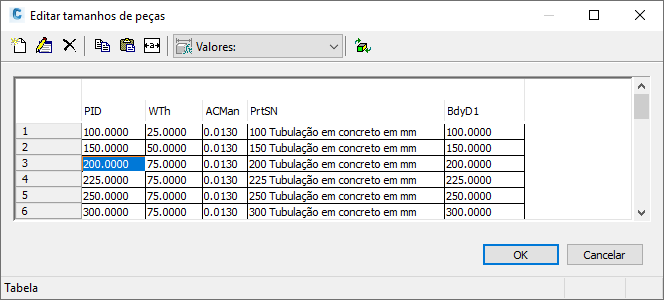 - Para alterar os valores para os tamanhos de tubulação, selecione a linha e célula de tamanho. Clique duas vezes para editar.