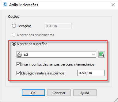 Na caixa de diálogo Atribuir elevações, selecione a opção A partir da superfície.