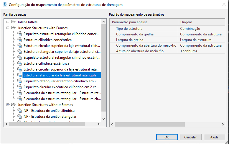 Mapear parâmetros de estruturas de drenagem. Na caixa de diálogo Mapear parâmetros de estruturas de drenagem, clique em Configuração do mapeamento.