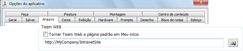 Marque a caixa de seleção para substituir a tela inicial do Inventor pela página do Team Web especificada.