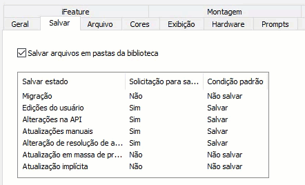 Ao fechar um arquivo com alterações que não foram salvas, o padrão é que uma caixa de diálogo pergunte se deseja salvar as alterações antes de fechar o arquivo. Clique nas entradas nas colunas Solicitação para salvar e Condição padrão para especificar o comportamento de salvamento para cada tipo de estado de salvamento. Utilize a caixa de seleção Salvar arquivos em pastas da biblioteca para controlar a condição padrão de salvamento de arquivos em pastas de bibliotecas do Centro de conteúdo. Quando essa opção estiver desmarcada, os arquivos em caminhos de bibliotecas não serão exibidos na caixa de diálogo Salvar nem serão salvos.