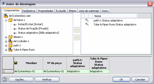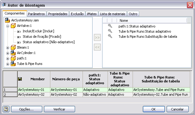 Autor do iPart/iAssembly. É exibido o nome do arquivo da montagem de trechos principais na lista de objetos que é, por padrão, Tube & Pipe Runs. Na tabela de configuração é selecionada automaticamente o status adaptativo.