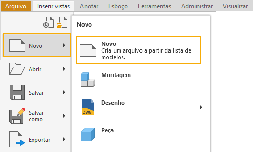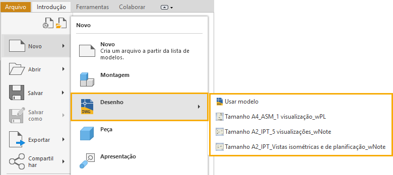 A partir de Arquivo Novo Desenho: Passe o mouse sobre a seta do menu desdobrável para que sejam exibidos os modelos de formato de folha disponíveis e clique para selecionar um item.