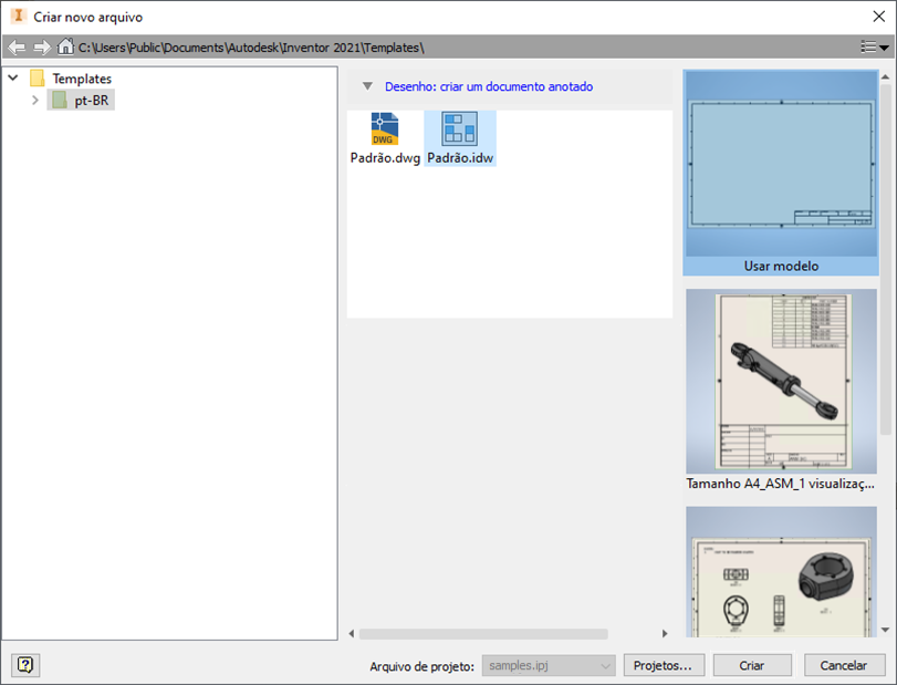 Na caixa de diálogo Criar novo arquivo, clique para selecionar um item na coluna à direita. Para abrir standard.idw (Usar modelo), clique em Criar. Também é possível clicar duas vezes em um modelo para abri-lo. |
