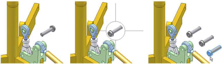 Usar orientação da última ocorrência para a inserção do componente = Ativada. Ativar este controle aumenta a produtividade. Por exemplo, se você insere um objeto e, a seguir, gira ou restringe-o, todos as novas instâncias são inseridas com a orientação original. A sequência seguinte mostra o resultado de ativar este ajuste, girar a primeira instância e inserir mais cópias.