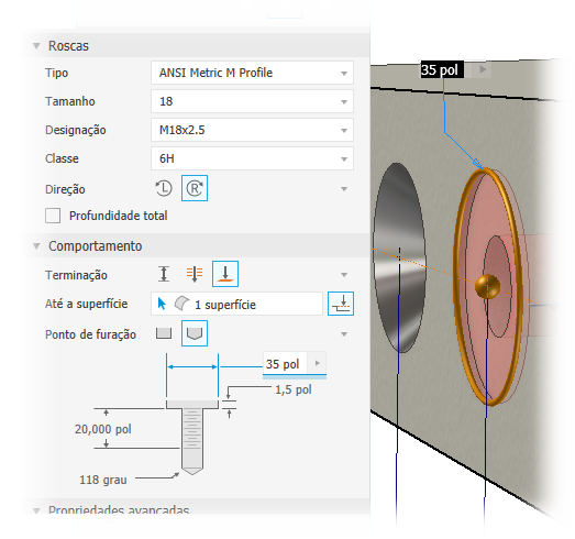 guia Modelo. Altere o valor de Diâmetro de furo roscado. O diâmetro do furo é definido automaticamente com base na especificação de rosca contida no arquivo Thread.xls.