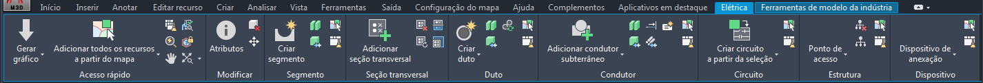 The Electric ribbon tab provides access to the most common operations in AutoCAD Map 3D toolset Electric. For example, you can create a segment using the Segment panel, add a Cross Section using the Cross Section panel, and then add ducts and conductors using the Duct and Conductor panels. Use the Circuit panel to define circuits by selecting the feature or by performing a trace. Use the Structure and Device panels to add structures and devices. The features you create using the Electric ribbon tab are displayed in the appropriate containers in the Electric Explorer. See Electric Explorer.