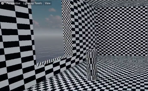 The Level Viewport switches to Lightmap Texels viewing mode, which displays a checker pattern on all objects to show you the UV unwrapping.