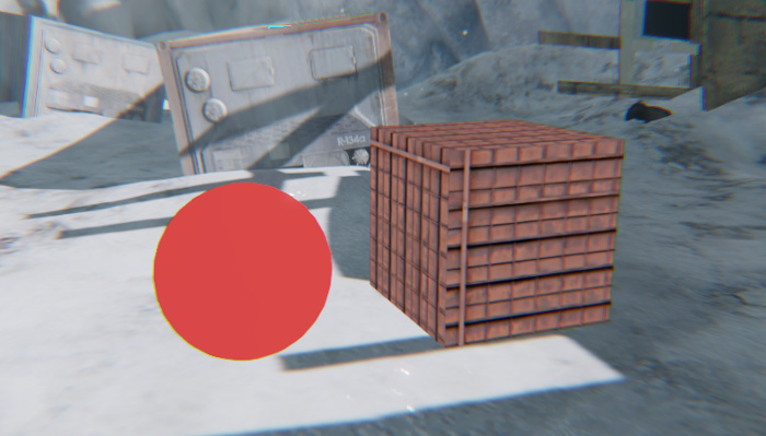 For example, the cube and sphere floating in this scene use standard physically based materials, with a frost texture applied on top as a decal:
