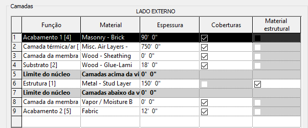 A posição, espessura e material para cada camada e região são definidas através das propriedades de tipo da parede usando a caixa de diálogo Editar montagem.