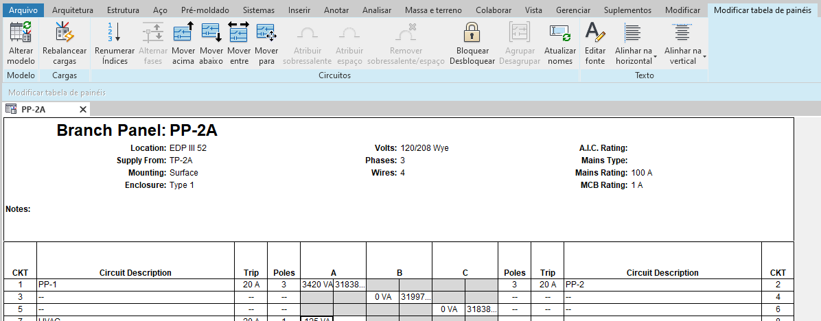 Quando uma tabela de painel é exibida, é possível reorganizar circuitos no painel ao movê-los para cima, para baixo, para a esquerda e para a direita, assim como agrupá-los e bloqueá-los no local. Também é possível balancear a carga em fases, atribuir reservas e espaços e atualizar nomes de circuito.