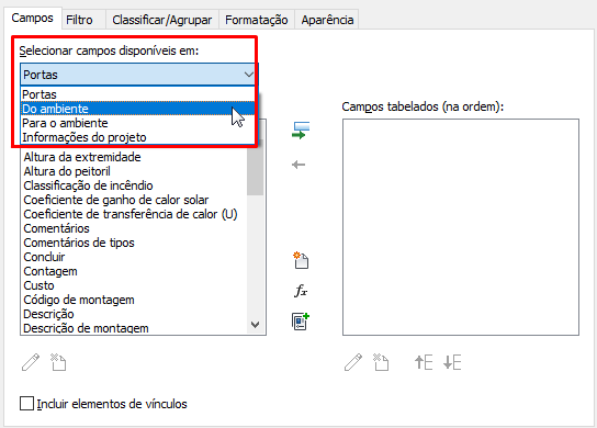 A tabela de portas é aberta. Como os campos Para o ambiente e Do ambiente não refletem automaticamente as alterações feitas na abertura da porta após a mesma ser colocada, é possível editar estes campos ao selecionar um valor na lista.