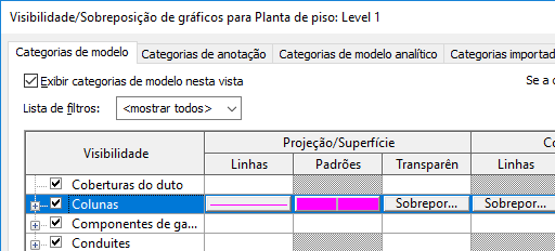 Na imagem a seguir, a categoria Colunas tem sobreposições para linhas de projeção/superfície.
