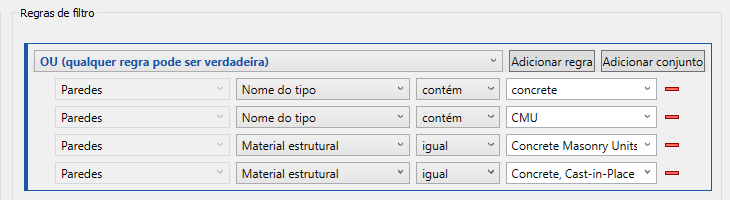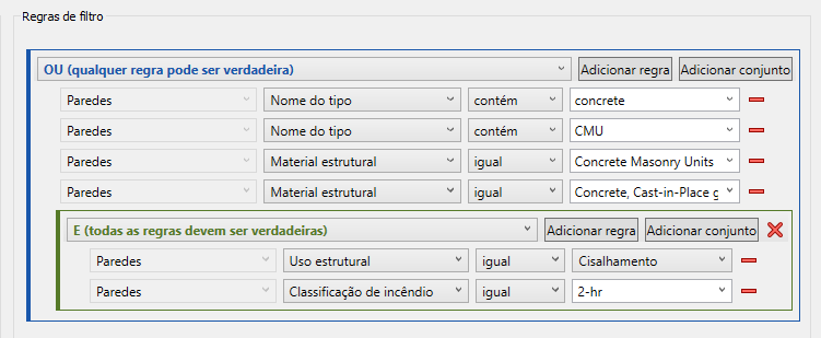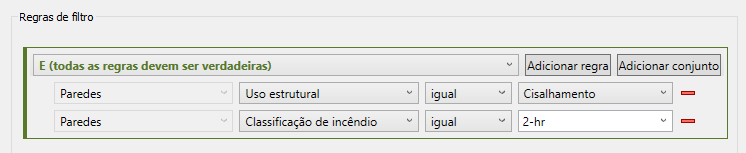 Nesse caso, para identificar todas as paredes de cisalhamento no modelo que são feitas de concreto e que têm uma classificação de proteção contra incêndio de 2 horas, você deve começar com o conjunto de regras E e aninhar um conjunto de regras OU no conjunto, como mostrado a seguir:
