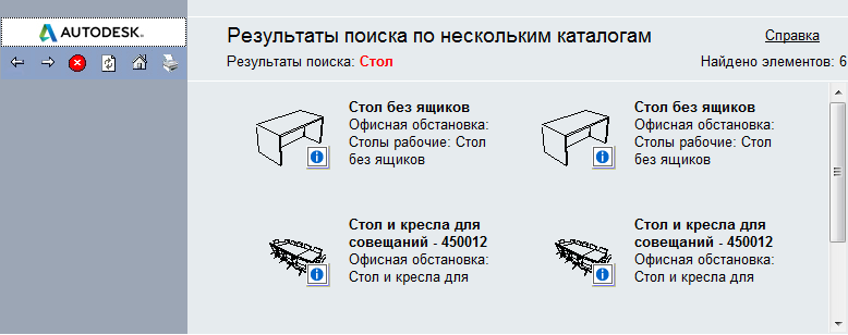 Результаты поиска выводятся в правой части окна Библиотеки компонентов. На приведенном ниже чертеже показаны результаты поиска в группе каталогов библиотеки термина 3D стол: