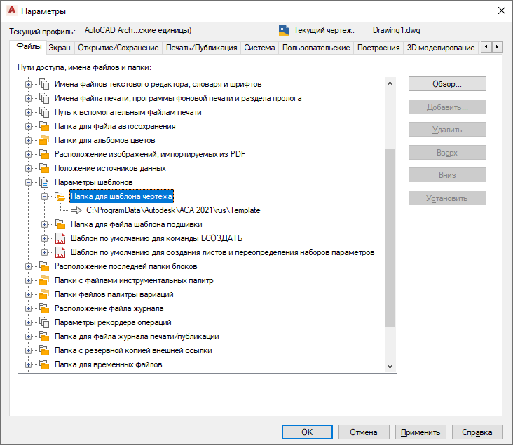 Задание папки для хранения файлов шаблонов в диалоговом окне "Настройка".