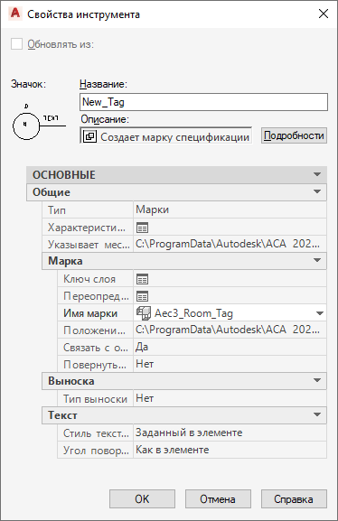 | идентифицировать тип инструмента, | нажмите "Тип" и выберите "Марка" для идентификации инструмента в качестве марки спецификации, либо выберите "Данные набора характеристик" для указания того, что инструмент прикрепляет данные характеристик без отображения марки. Когда данные набора характеристик прикрепляются к объекту, характеристики отображаются в спецификации и на палитре свойств, но марка не отображается на объекте. |