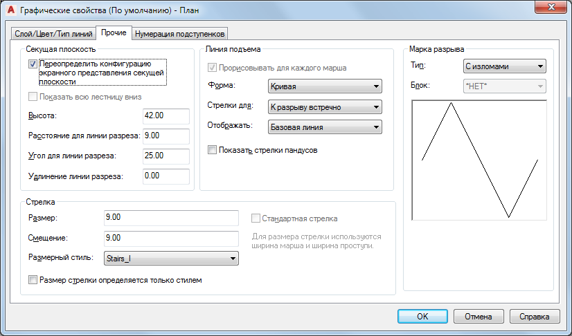 | на конце каждой плоскости сечения и каждого марша отобразить стрелки, указывающие в одном и том же направлении, | для параметра "Применить" выберите "К разрыву и от него" и убедитесь в том, что опция "Прорисовывать для каждого марша" выбрана. |