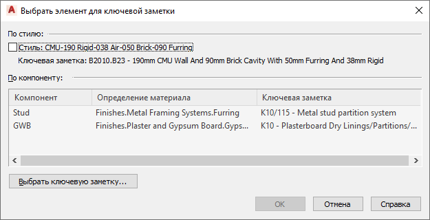 открывается диалоговое окно "Выбор элемента для ключевой заметки". - Если требуется присвоить ключевую заметку компоненту объекта, выберите его в столбце "Компонент" и нажмите "OK".