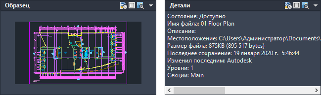 Ниже Диспетчера чертежей на палитре структуры проекта находится панель образца или сведений. Данная панель отображается после щелчка правой кнопкой мыши в нижней части палитры структуры проекта и выбора из меню "Стиль подсказок" пункта "Панель образца/сведений".