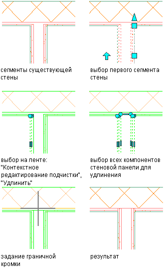 Данная процедура применяется для редактирования пересечения стен путем удлинения компонента. Границей удлинения может служить линия, дуга, окружность. полилиния или кромка компонента стены.