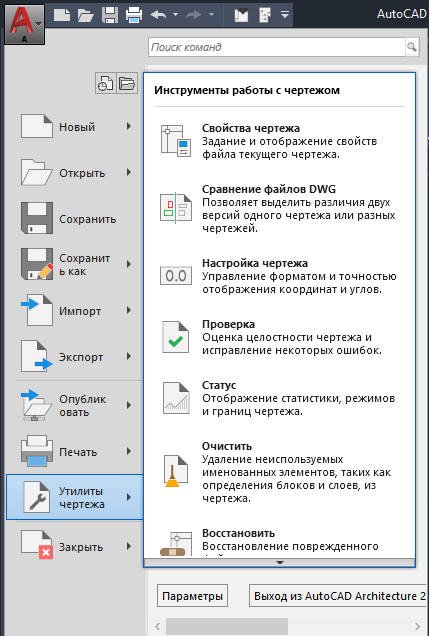 В меню приложения содержатся команды, относящиеся к созданию чертежей в целом.