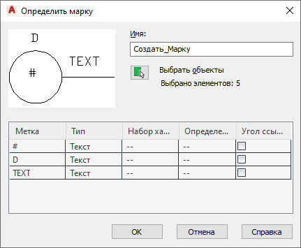 Эта процедура служит для создания марки спецификации, которая захватывает и отображает данные набора характеристик для определенного объекта на чертеже.