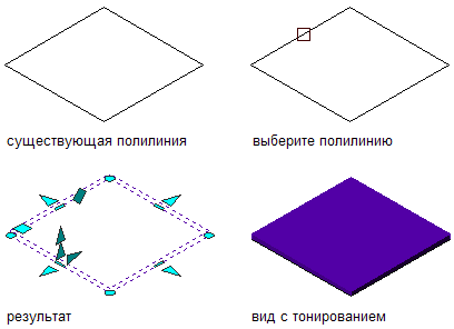 Эта процедура используется для преобразования замкнутой полилинии в одиночный объект перекрытие или скат крыши, свойства которого определяются выбранным инструментом. Эти свойства можно отредактировать после создания объекта. Кромкой перекрытия или ската крыши по базовой линии становится первая построенная линия полилинии.