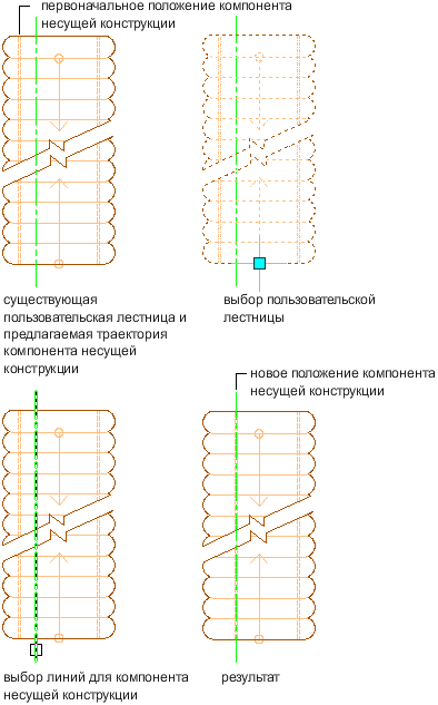 Эта процедура используется для замены существующей траектории несущей конструкции пользовательской лестницы на новую траекторию посредством выбора линии. Чтобы линию можно было выбрать для замены траектории несущей конструкции, она должна находиться внутри лестницы и повторять траекторию лестницы по всей длине.