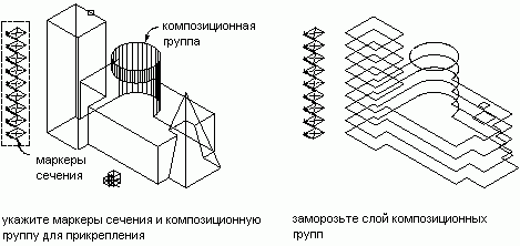 Эта процедура используется для присоединения формообразующих элементов или композиционных групп к сечению для создания сечения здания. Слой (слои), содержащий формообразующие элементы и композиционные группы, можно заморозить для отображения исключительно сечений.