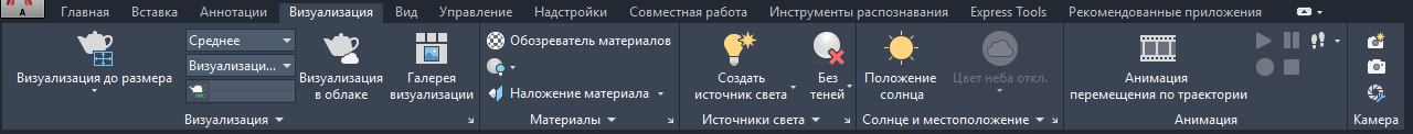 Вкладка "Визуализация" содержит все команды, необходимые для работы с визуализацией, материалами, источниками света, камерами и анимациями.
