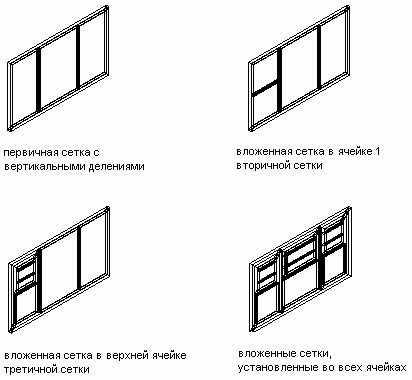 Для создания нескольких уровней можно продолжить добавление вложенных сеток. Например, на следующем чертеже показаны сетка стандартного стиля оконной/дверной сборки, такая же сетка с вложенной сеткой в одной ячейке вторичной сетки и та же самая сетка с вложенными сетками во всех ячейках вторичной сетки.