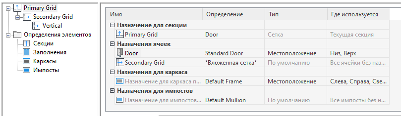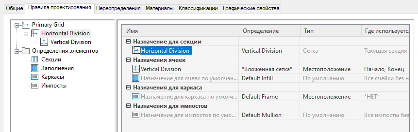 Задать вложенные сетки можно на вкладке "Правила проектирования" диалогового окна "Свойства стиля дверных/оконных сборок". В левой части вкладки в дереве структуры отображается список сеток. В этом списке всегда присутствует первичная сетка. Первичная сетка может иметь одну или несколько вторичных сеток. Каждая вторичная сетка может иметь одну или несколько сеток третьего уровня и так далее.
