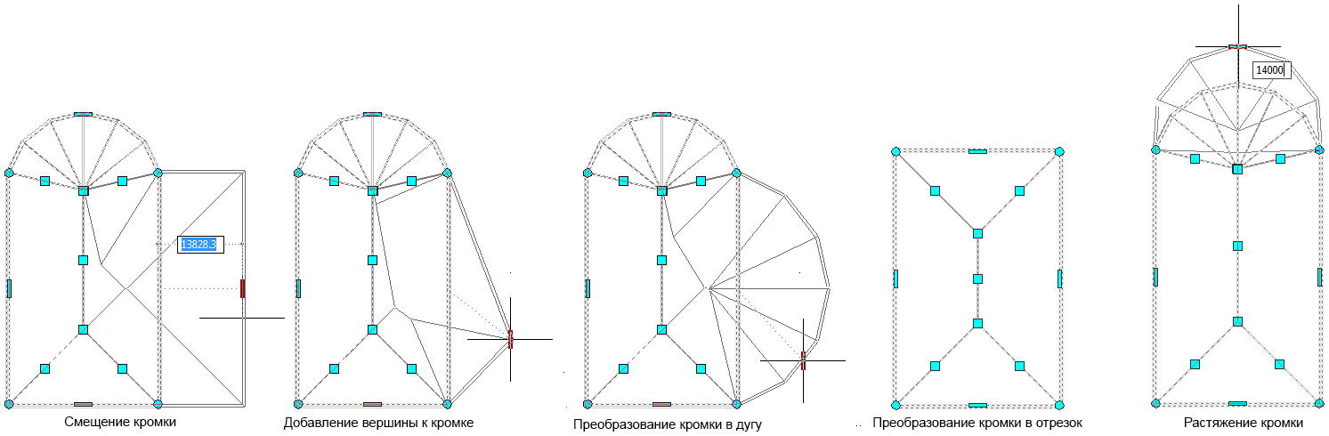 Ручка "Кромка" имеет пять режимов редактирования: "Смещение", "Добавить вершину", "Преобразовать в дугу", "Преобразовать в отрезок" и "Растянуть".