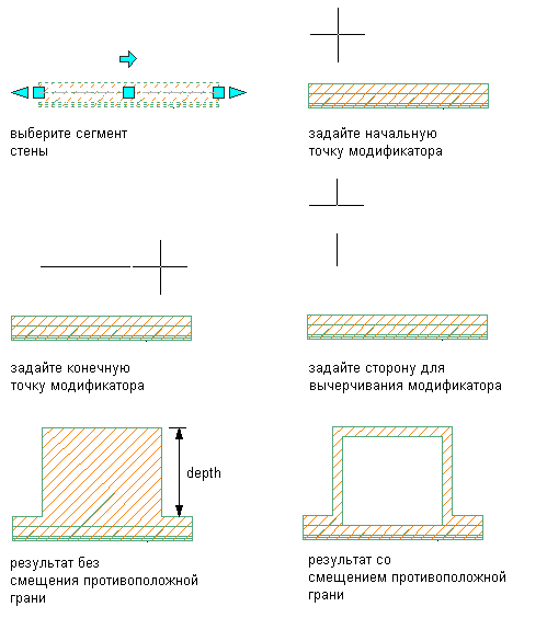 Модификаторы поверхности можно добавлять к одной или обеим сторонам стены. При выборе поверхности можно выполнить также смещение модификатора поверхности относительно противоположной поверхности с целью создания "выбоин", например, для каналов или внутренних колонн.