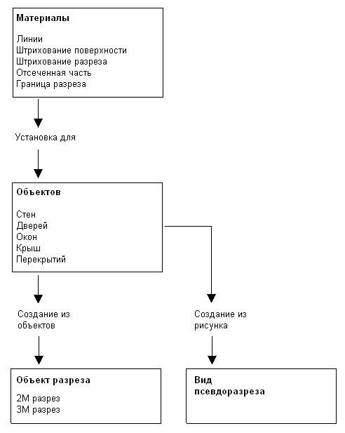При создании объекта 2D или 3D разреза из объектов здания назначения материалов для исходных объектов применяются к зданию. Материал не присваивается непосредственно 2D/3D разрезу. Назначения материалов в разрезе берутся из отсеченных объектов. Например, если разрез проводится через стену с окном, то штриховка разреза, определенная для таких материалов, как стекло, дерево и кирпич для стены и окна, отображаются в разрезе.