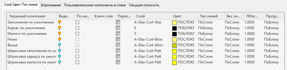 Данная процедура предназначена для того, чтобы задать свойства одной или нескольких секущих плоскостей в стиле витража. Графические свойства секущей плоскости относятся только к таким экранным представлениям как "План", которые используются на видах чертежа сверху (в плане).