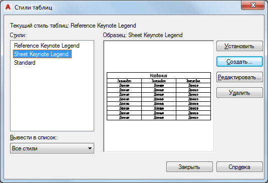 В легендах ключевых заметок используются стили таблиц AutoCAD. Данная процедура используется для редактирования имеющихся стилей таблиц.