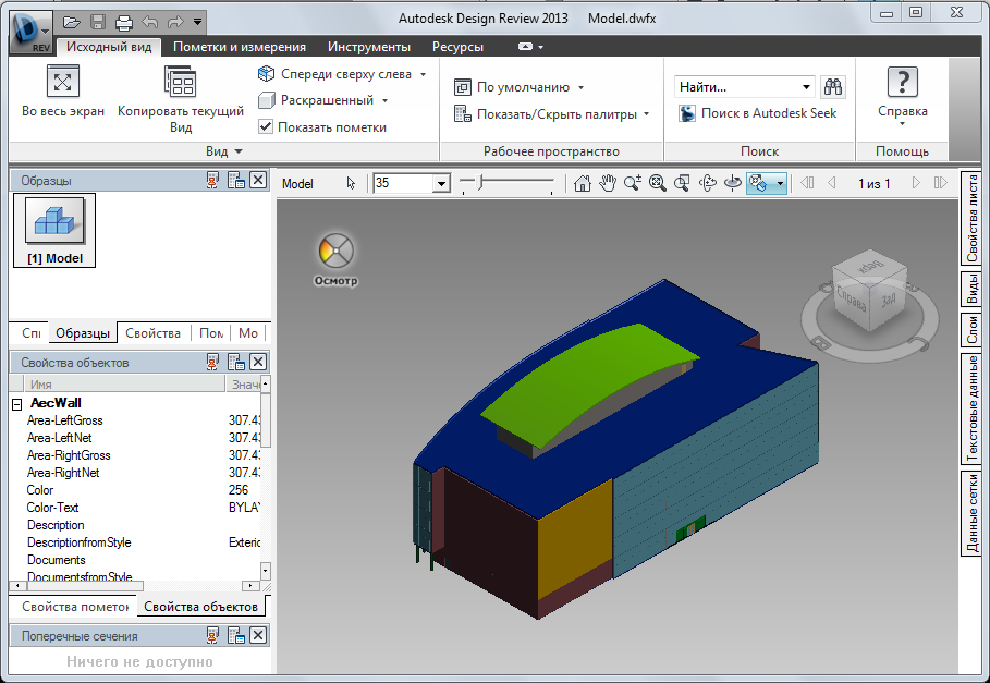 Можно опубликовать собственные DWG-файлы в формате DWF или DWFx в виде 2D или 3D моделей с включением набора характеристик. При просмотре таких файлов в Autodesk Design Review пользователи могут выбрать компоненты, представляющие объекты, и просмотреть сведения об объектах на палитре "Свойства объектов".
