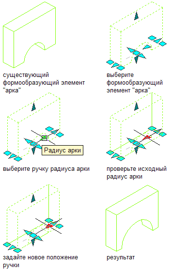 Эта процедура используется для изменения радиуса арки посредством ручек в формообразующем элементе "Арка".