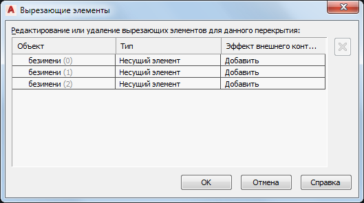 Прим.: Это диалоговое окно также используется для удаления вырезающего элемента посредством нажатия правой кнопки мыши на ячейке "Объект" или "Тип" и выбора "Удалить". Альтернативный способ: используйте контекстную вкладку перекрытия или ската крыши, как описано в разделе "Удаление вырезающих элементов перекрытия/ската крыши". При удалении вырезающего элемента происходит удаление связи перекрытия/ската крыши с объектом, который использовался для создания этого элемента. Сам объект не удаляется из чертежа.