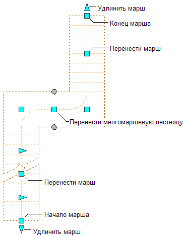 Ручки "Начало и конец марша", "Перенести марш", "Переместить многомаршевую лестницу" и "Удлинение лестницы" для многомаршевой лестницы