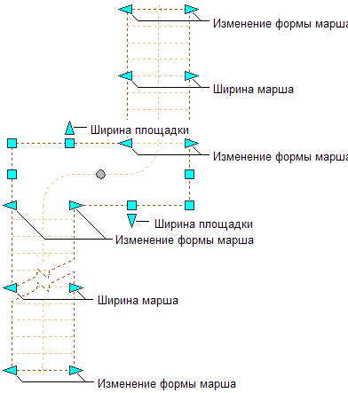 Ручки "Изменение формы марша", "Ширина марша" и "Ширина площадки" для многомаршевой лестницы.