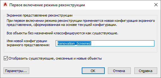 При первом включении режима реконструкции создается особая конфигурация экранного представления для реконструкции. Эта конфигурация является копией текущей, существующей конфигурации экранного представления со словом Renovation, добавляемым в качестве префикса.